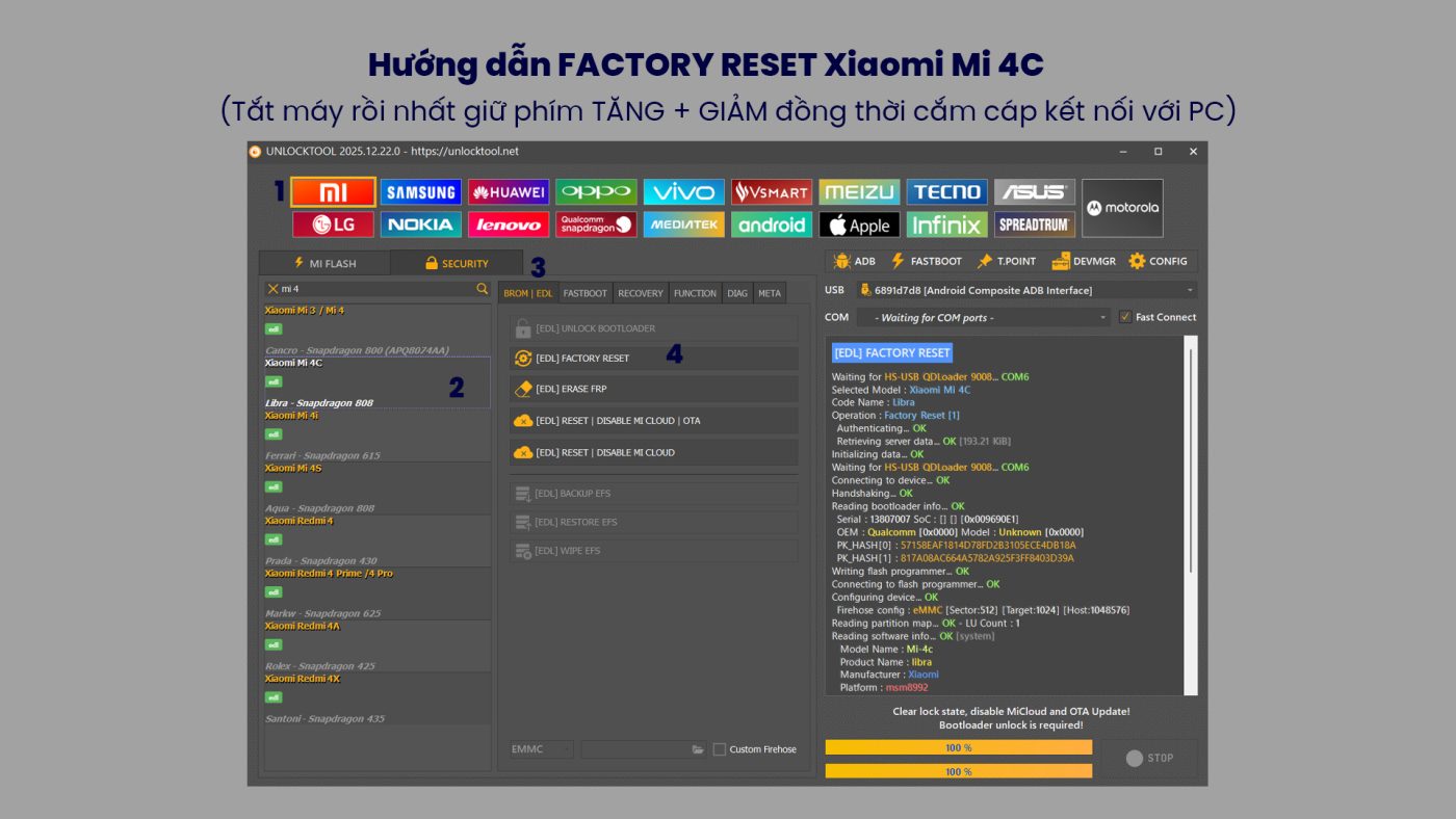 📌 Các bước Reset Xiaomi Mi 4C bằng UnlockTool