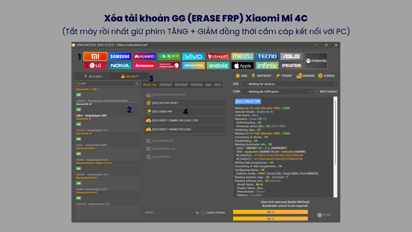 📌 Các bước xóa tài khoản Google Xiaomi Mi 4C bằng UnlockTool